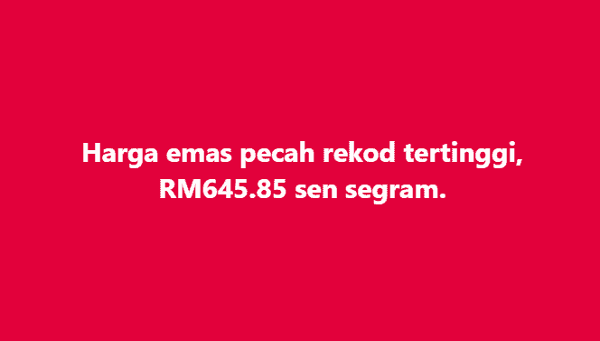 Harga emas hari ini mencecah RM645.85 sen segram, sekaligus memecahkan rekod tertinggi sebelum ini iaitu sekitar RM463 per gram pada Mac yang lalu. Untuk melihat harga emas hari ini dan kadar semasa, anda boleh semak di www.arrahnuyapeim.net/ dan beberapa portal lain.